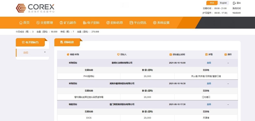 On August 10, E-tender Board of COREX system was officially launched, and members such as Xiamen ITG Group Corp., Ltd., Hunan Valin Steel Company Ltd., HBIS Group Beijing International Trade Co., Ltd. and Shougang Changzhi Iron & Steel Co., Ltd released procurement and sales tendering information through the board, involving trading brands such as FMG Super Special Fines, IOC6 and Chilean Concentrate and delivery place such as Tianjin Port, Lanshan Port, Lanqiao Port, Rizhao Port, Dongjiakou Port and other ports along the Yangtze River.