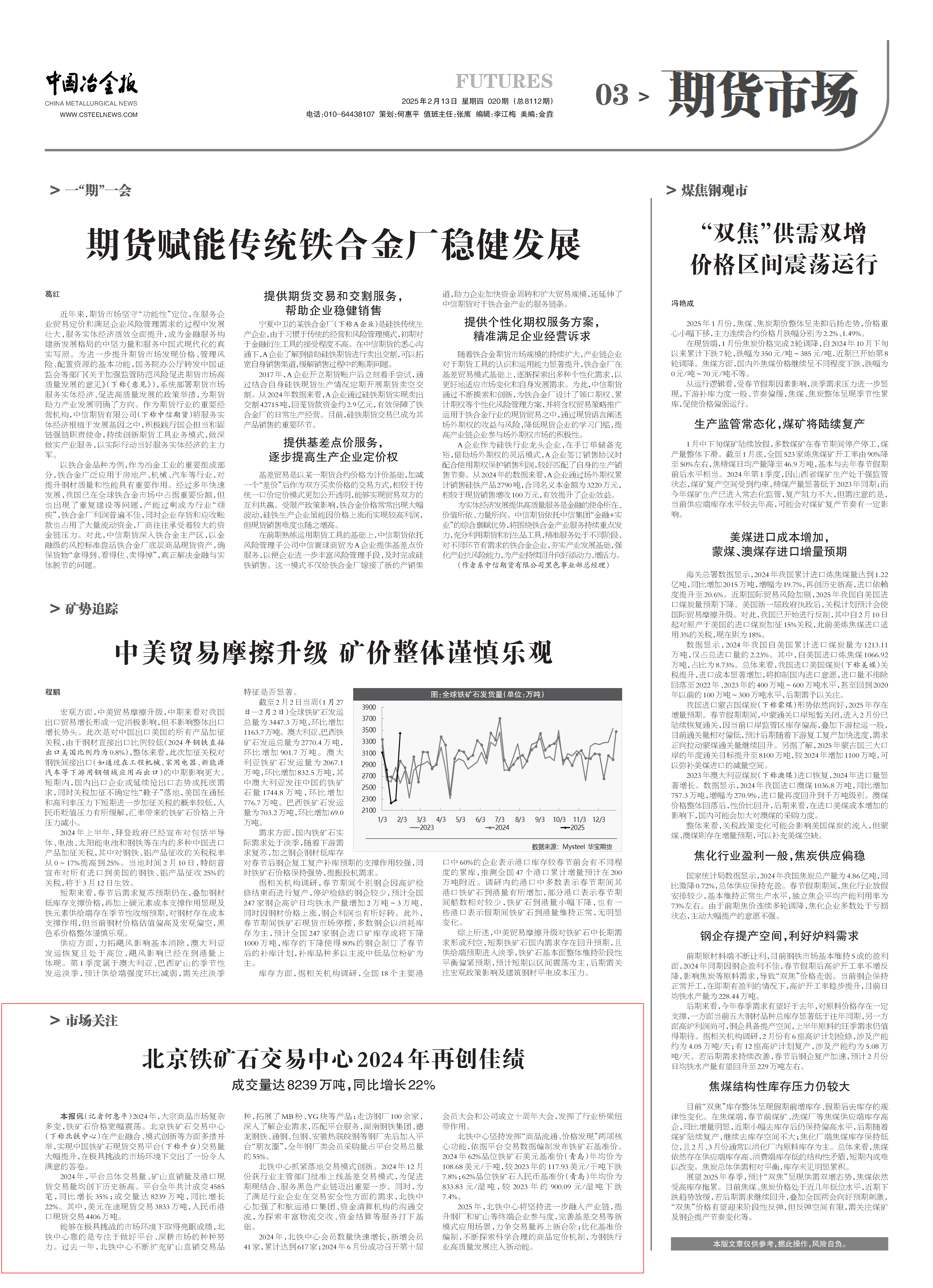 本報訊(記者何惠平)2024年,大宗商品市場復雜多變,鐵礦石價格寬幅震蕩。北京鐵礦石交易中心(下稱北鐵中心)在產業(yè)融合、模式創(chuàng)新等方面多措并舉,實現(xiàn)中國鐵礦石現(xiàn)貨交易平臺(下稱平臺)交易量大幅提升,在極具挑戰(zhàn)的市場環(huán)境下交出了一份令人滿意的答卷。