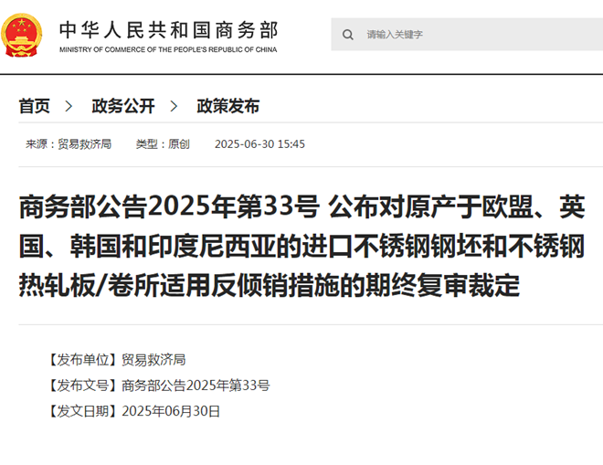 6月30日,商務部發(fā)布公告,公布了對原產于歐盟、英國、韓國和印度尼西亞的進口不銹鋼鋼坯和不銹鋼熱軋板/卷所適用反傾銷措施的期終復審裁定。